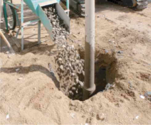 砕石を投入し、ピストンバルブによる側壁圧密と底部圧密を掛けながら地上まで砕石パイルを形成していきます。