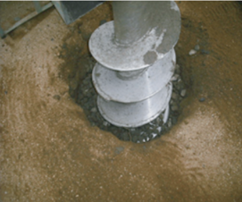 ピストンバルブ(先端ドリル部分)で施行材(砕石)で突き固めます。ピストンバルブのハンマー転圧機能により、従来の施工時間を大幅に削減します。砕石パイル施工後は基礎工事へと、すぐに取り掛かれます。