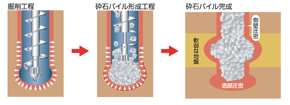 砕石パイル形成時の転圧作業で水平方向にも圧密が掛かるので、軟弱な地盤の中でも摩擦抵抗の高い丈夫な砕石パイルが造られ、さらに強い底部圧密で砕石パイルを支えます。