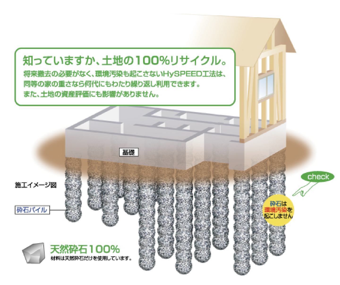 「HySPEED工法」は、天然砕石のみを使用して地盤に杭を作る改良工法です。この工法では、地盤に掘削した穴に天然砕石を詰め込み、石柱を形成します。天然砕石以外の材料は使用しないため、従来の工法で用いられるセメントや鋼管杭とは異なり、産業廃棄物が出る心配がなく、六価クロムも発生しません。これにより、土地の評価額が下がるリスクも避けられます。人にも環境にも優しく、強度の高い地盤を形成できる工法です。