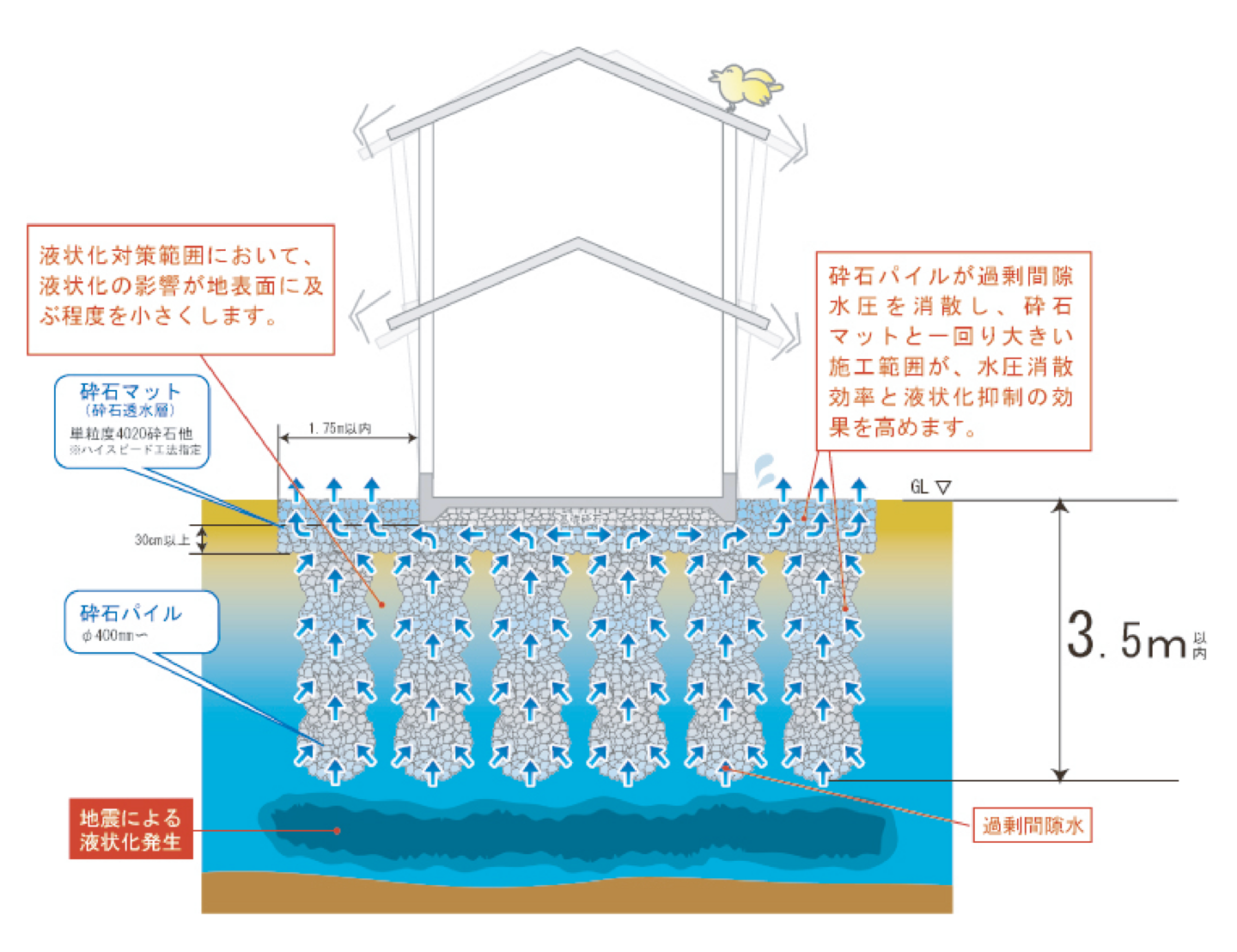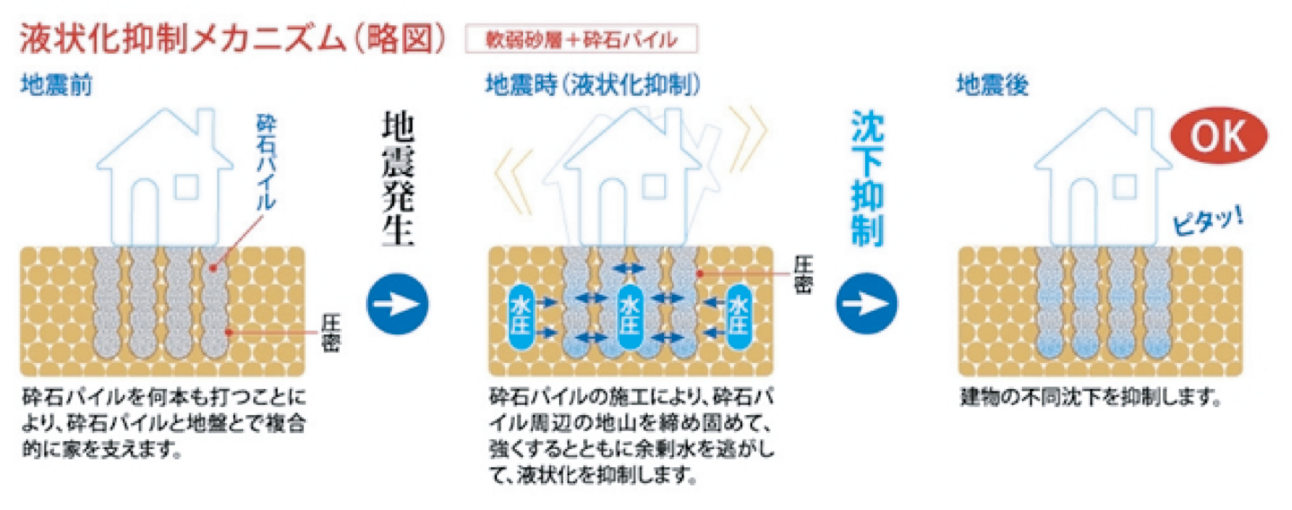 液状化対策をしておきたいけど、施工費用の都合がつかない。液状化対応型の「砕石マット」を追加しただけでは不安!そんなあなたに、木造2階建て住宅程度の重さなら、液状化層をすべて改良しなくても、砕石パイルが液状化に有効なことが、 東日本大震災の調査で明らかになりました。そこで、地表面から3.5mまでのライトな液状化対策ができました。※建物安定には別途検討が必要です。